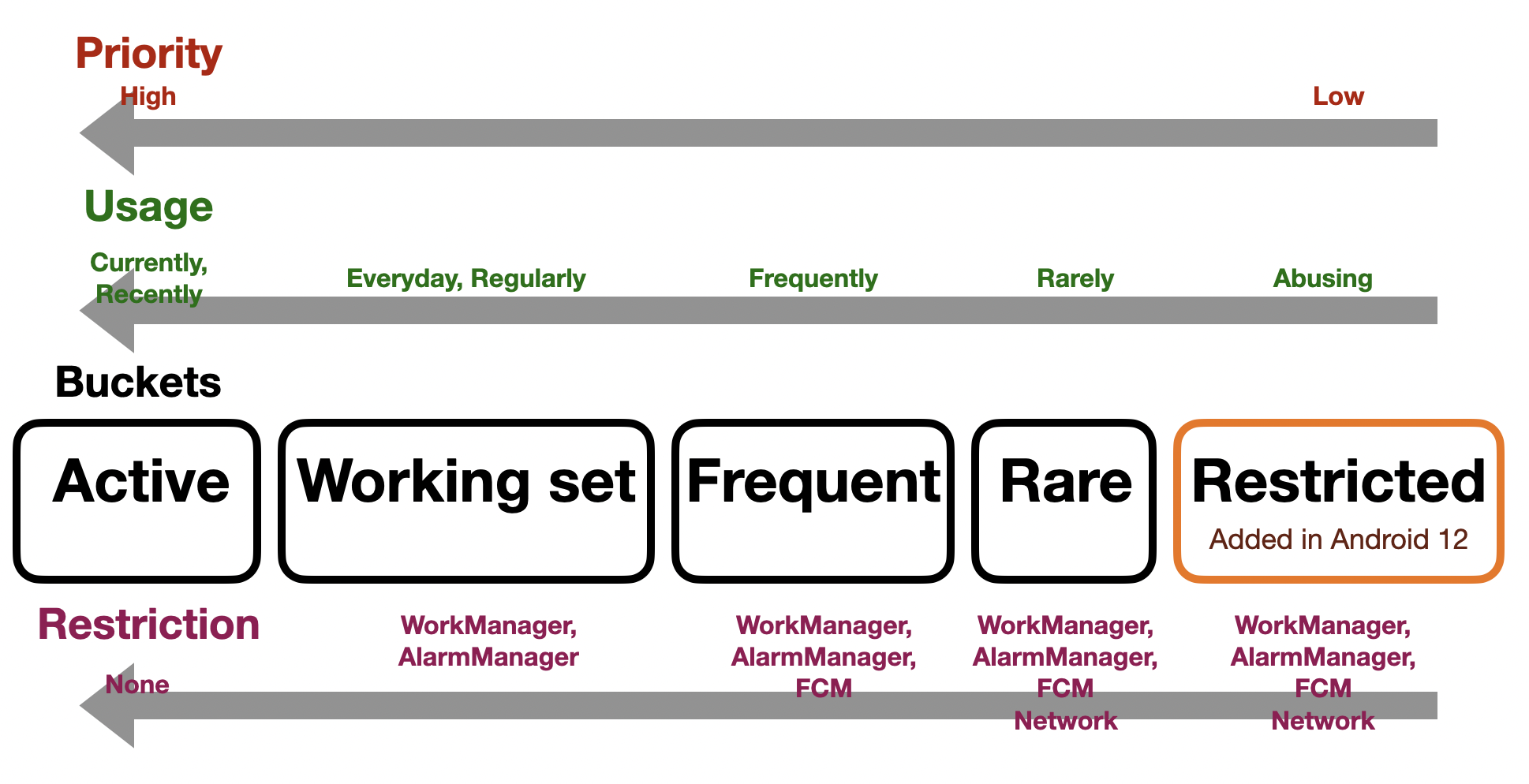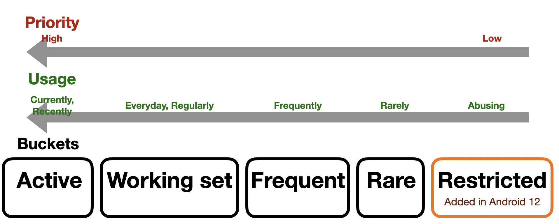- 시스템은 사용 패턴 뿐만아니라 앱이 시스템 리소스를 어뷰징하는지도 판단해 해당 버킷에 배치시킨다.