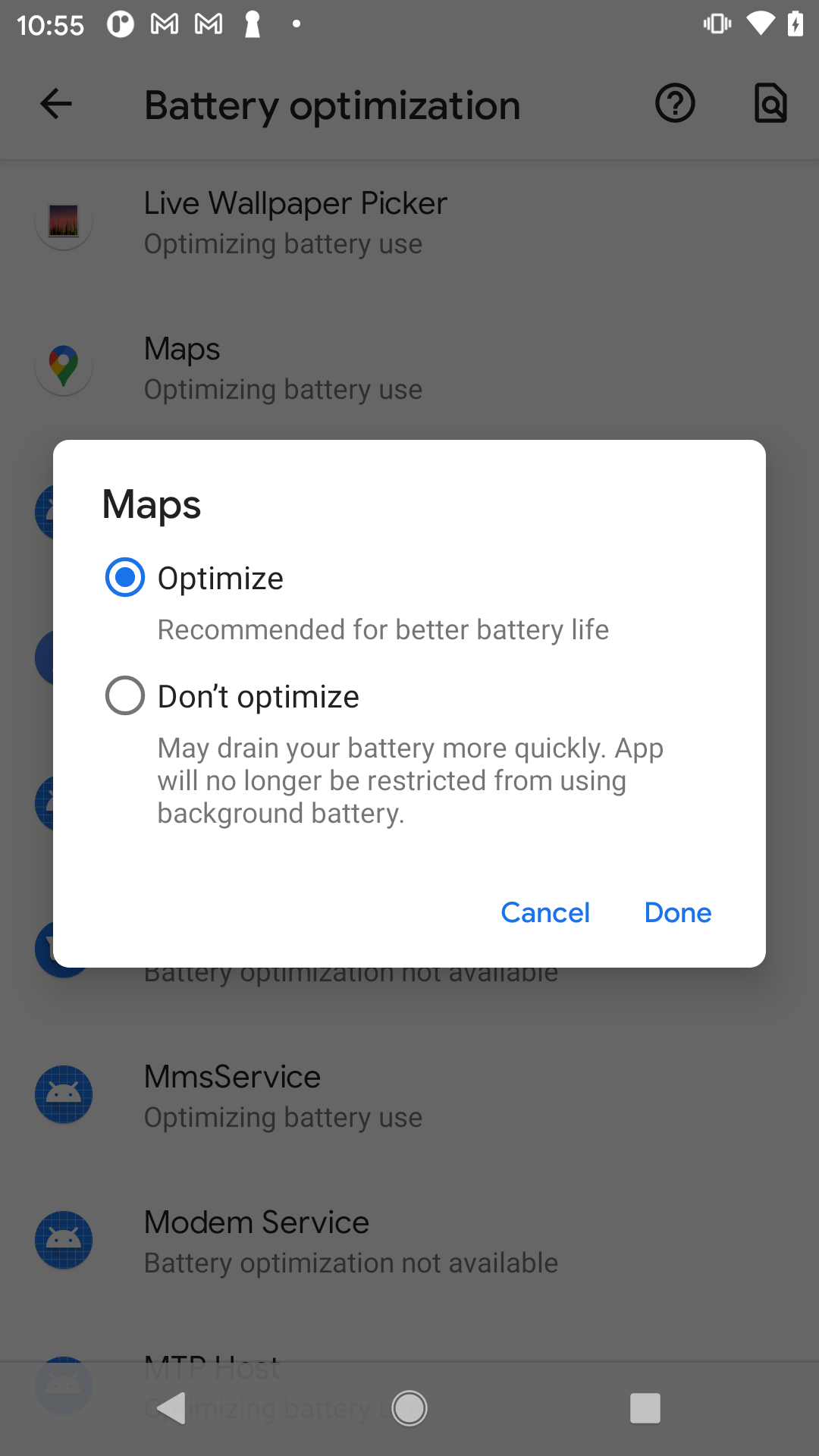 Background restriction가 제일 강력한 제한이라 Battery Optimization로 제한되고 있는지 알기 어려움