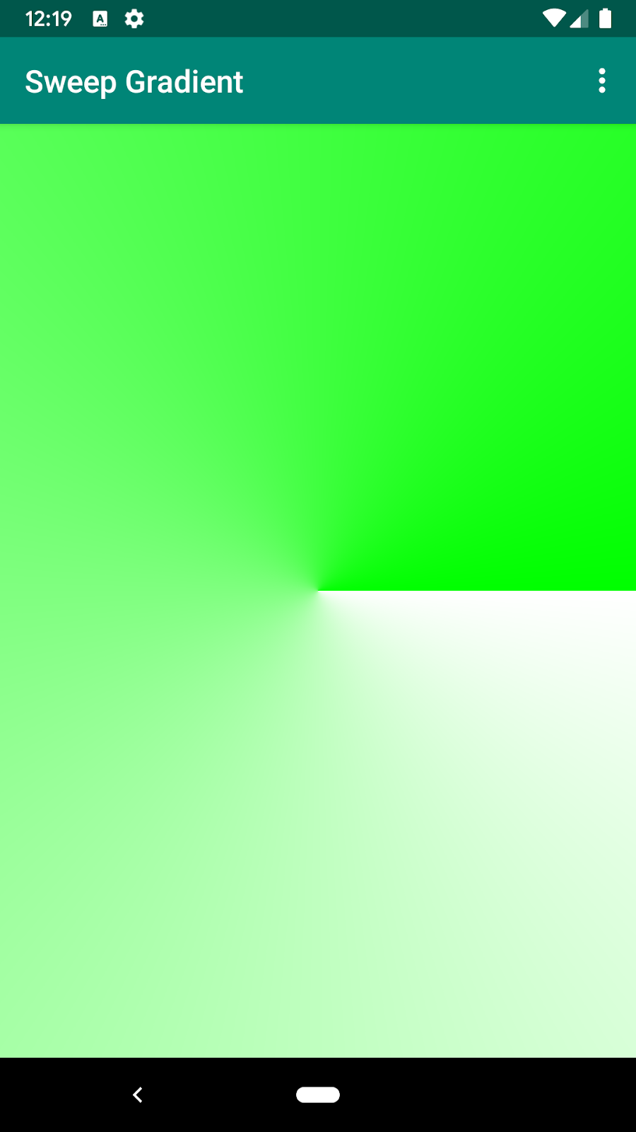 // activity_simple_shader.xml <androidx.constraintlayout.widget.ConstraintLayout xmlns:android="http://schemas.android.com/apk/res/android" xmlns:app="http://schemas.android.com/apk/res-auto" xmlns:tools="http://schemas.android.com/tools" android:layout_width="match_parent" android:layout_height="match_parent" tools:context=".SimpleShaderActivity"> <com.example.opengles.custom.SimpleShaderImageView android:layout_width="match_parent" android:layout_height="match_parent" app:shaderName="gradient" /> <!-- simple, gradient --> </androidx.constraintlayout.widget.ConstraintLayout> // SimpleShaderImageView.kt @RequiresApi(33) class SimpleShaderImageView @JvmOverloads constructor( context: Context, attrs: AttributeSet? = null ) : AppCompatImageView(context, attrs) { private var shaderName: String? private val simpleShader: RuntimeShader = RuntimeShader( """ layout(color) uniform half4 iColor; half4 main(float2 fragCoord) { return iColor; } """.trimMargin() ) private val gradientShader: RuntimeShader = RuntimeShader( """ uniform float2 iResolution; half4 main(float2 fragCoord) { float2 scaled = fragCoord / iResolution.xy; // both of x = 0~1080, y = 0~1668 return half4(scaled, 0, 1); } """.trimMargin() ) private val paint: Paint = Paint() init { context.theme.obtainStyledAttributes( attrs, R.styleable.ShaderImageView, 0, 0 ).apply { try { shaderName = getString(R.styleable.ShaderImageView_shaderName) } finally { recycle() } } } override fun onDrawForeground(canvas: Canvas?) { super.onDrawForeground(canvas) val requiredShader: RuntimeShader = when (shaderName) { "gradient" -> { gradientShader.setFloatUniform("iResolution", width.toFloat(), height.toFloat()) gradientShader } else -> { simpleShader.setColorUniform("iColor", Color.GREEN) simpleShader } } paint.shader = requiredShader canvas?.drawPaint(paint) } }Animating the shader