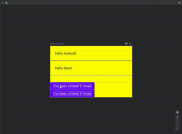 @Composable fun MyScreenContent(names:List<String> = listOf("Android", "there")) { Column { for (name in names) { Greeting(name = name) Divider(color = Color.Black) } Divider(color = Color.Transparent, thickness = 32.dp) Counter() } }Preview에서 인터랙티브 모드로 변경하면 버튼을 누를 때마다 Counter가 상태를 유지하는 것을 볼 수 있다.