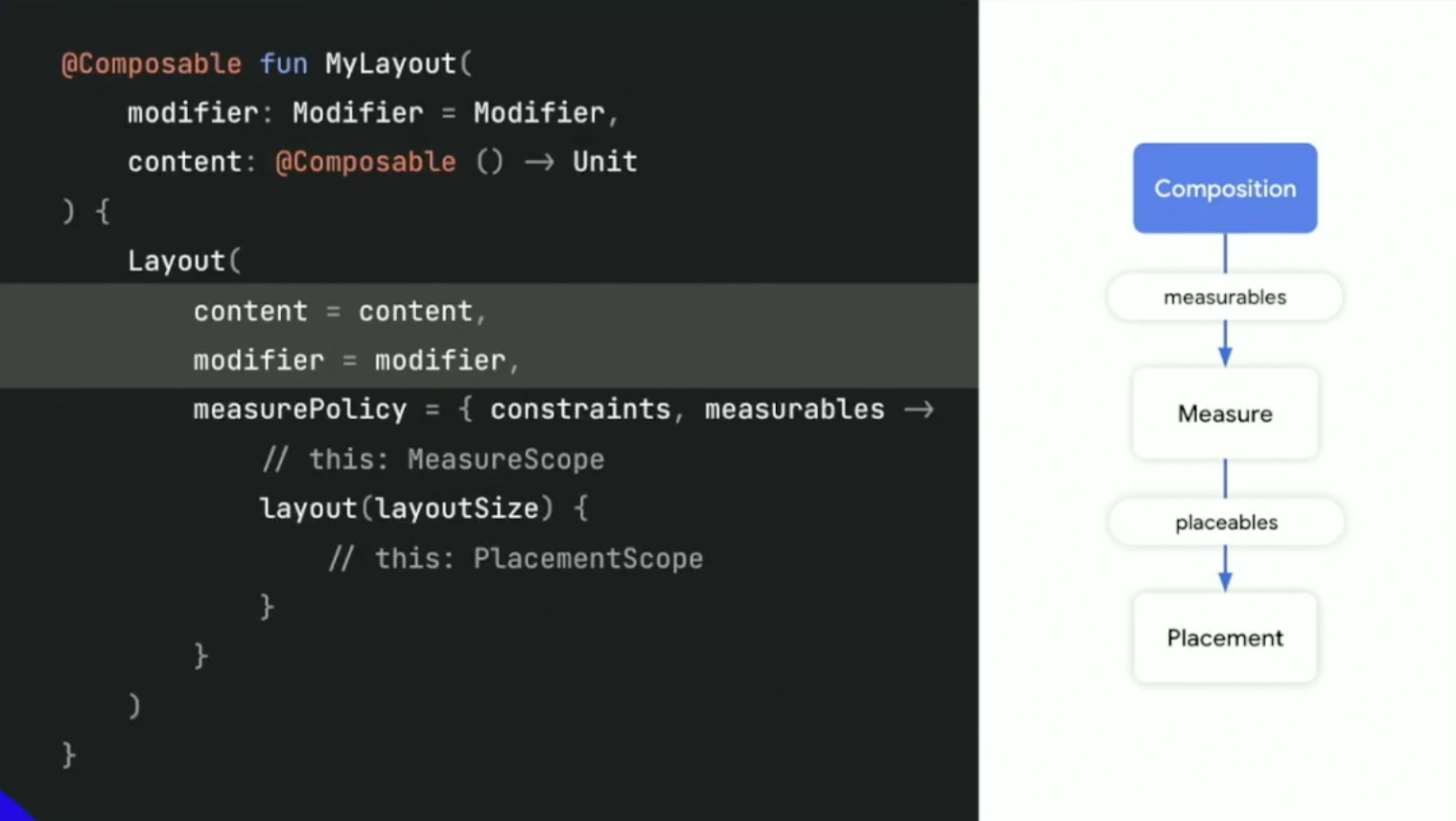@Composable fun MyCustomLayout( modifier: Modifier = Modifier, content: @Composable () -> Unit ) { Layout( modifier = modifier, content = content ) { measurables: List<Measureable>, constraints: Constraints -> // TODO measure and place items } }It's parameters include measurable and constraints. We can measure composables by given measurable and constraints.