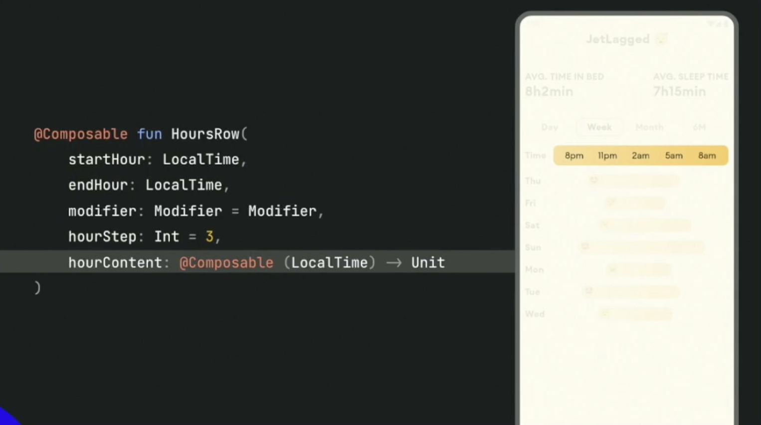 The first thing inside this row is to figure out which labels which local times correspond to the labels that you want to have and which composable will show this labels on screen.