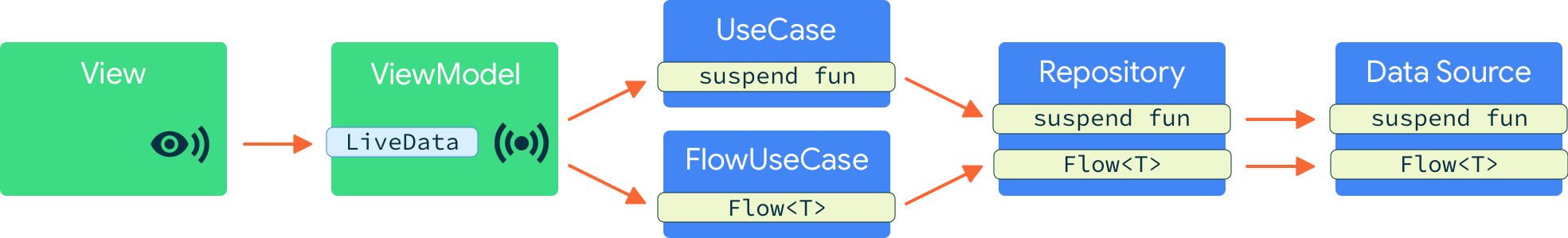 많은 Android 앱들은 필요한 데이터를 network나 cache로 lazy하게 load한다. 그래서 몇 가지 특징을 찾을 수 있는데 View와 ViewModel 사이에 LiveData로 communication 하는 것과 UseCase와 그 밑 layer들은 Coroutine과 Flow을 사용한다는 것을 볼 수 있다.