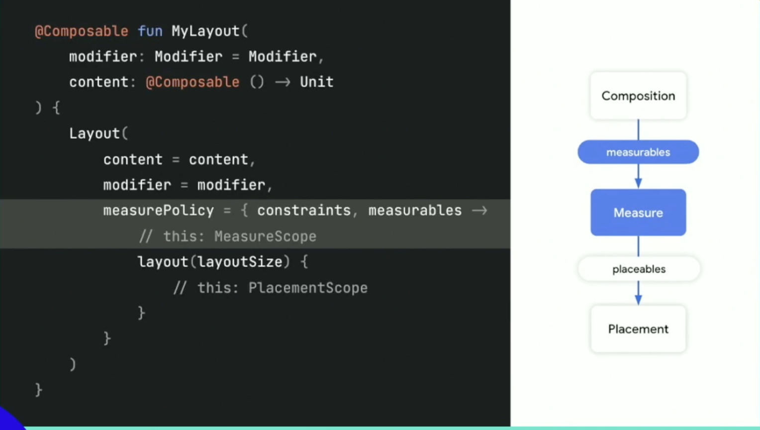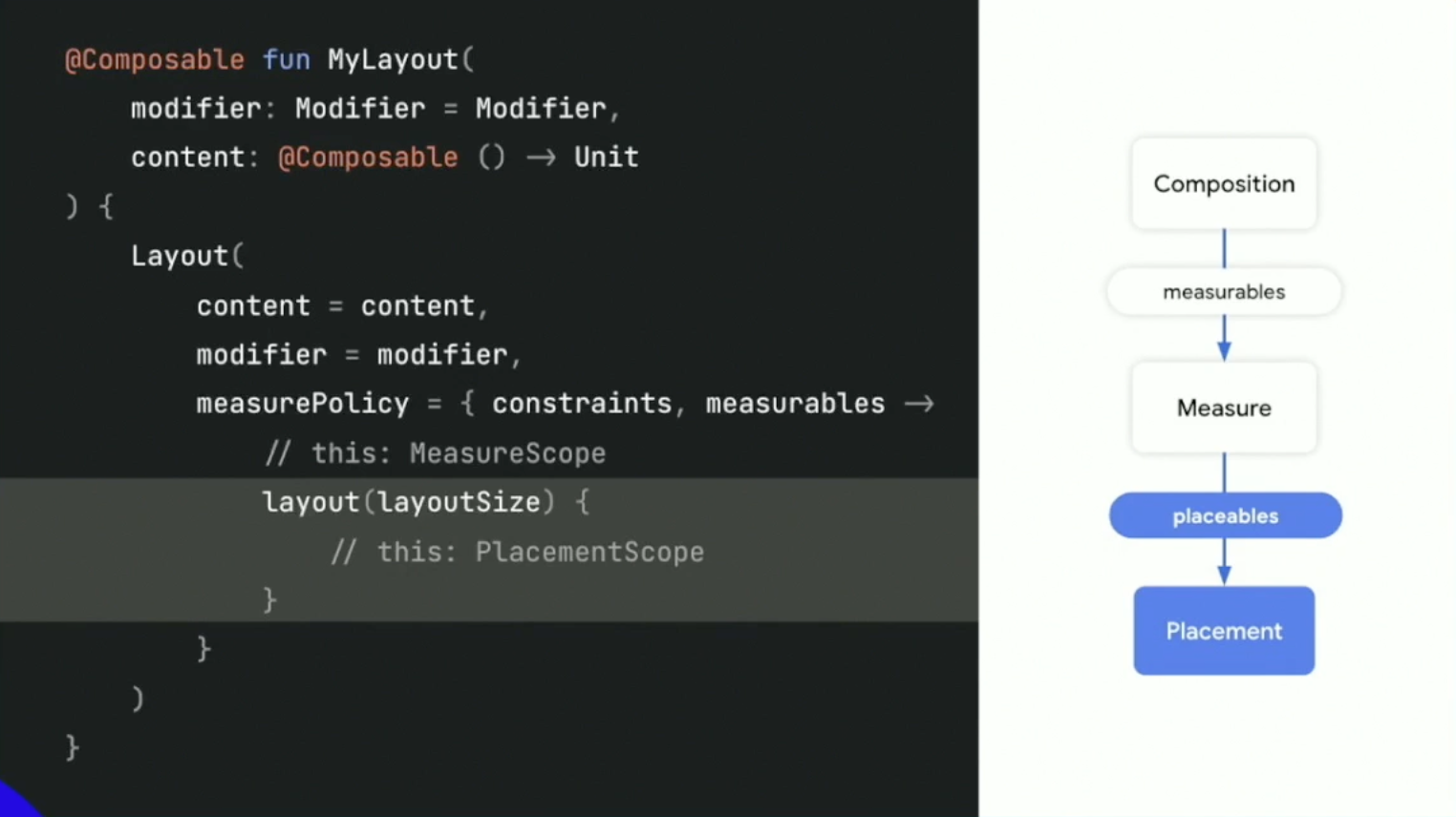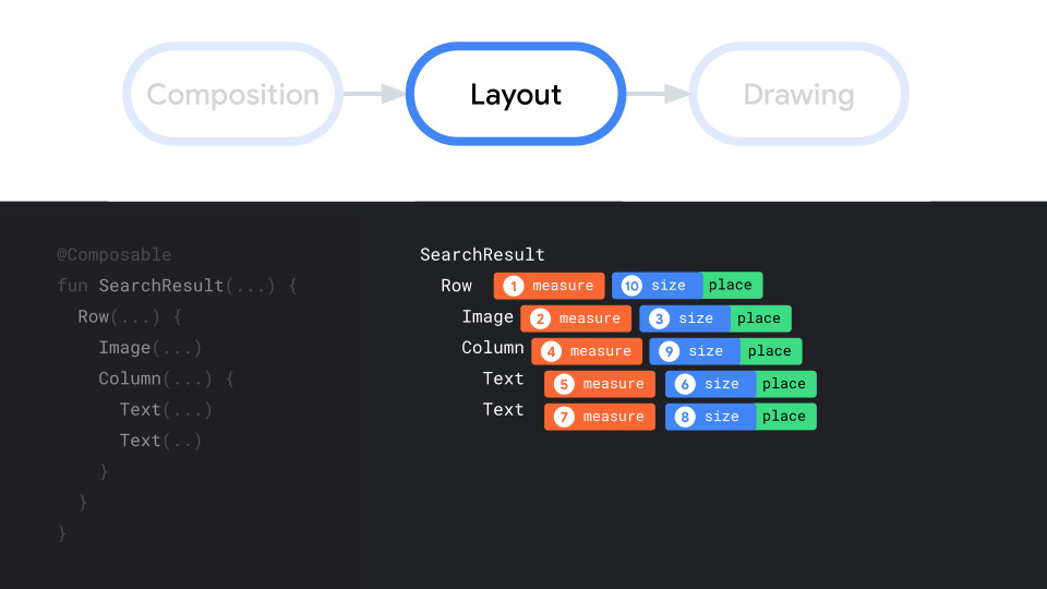 These are roughly equivalent to onMeasure and onLayout in the View. But in Compose, these phases are intertwined.